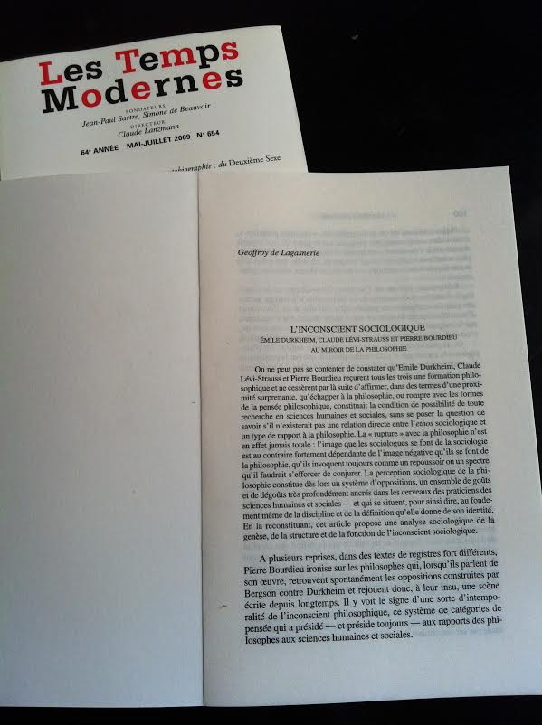 J’ai publié, en 2009, dans Les Temps Modernes, un article intitulé : « L’inconscient sociologique. Emile Durkheim, Claude Lévi-Strauss et Pierre Bourdieu au miroir de la philosophie ». Il est désormais en accès libre sur le portail cairn. On peut donc le lire en cliquant ici :