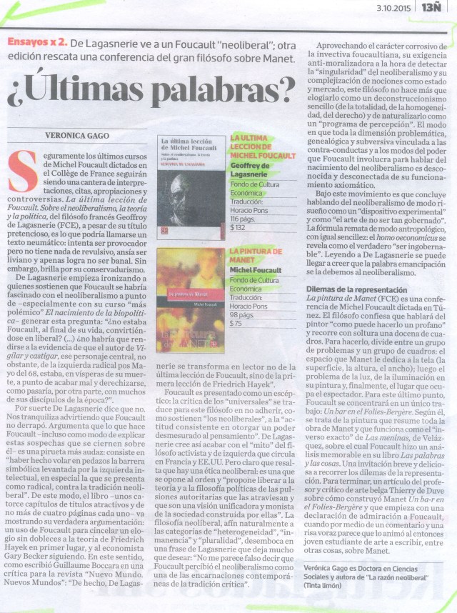 Les attaques publiées par l’auteur d’un compte-rendu – Veronica Gago – de mon livre La Ultima Leccion de Michel Foucault dans le supplément N du journal argentin Clarin appartiennent à cette catégorie. L’incompréhension n’est pas surprenante et son article n’a rien d’original. Elle exprime la manière dont celles et ceux qui adhérent sans distance à des perceptions installées réagissent à un livre qui pose des questions nouvelles. L’auteur ne peut pas rendre compte de mon livre et comprendre mon projet. Elle leur reste extérieure. Elle lit avec des lunettes idéologiques un livre de réflexion. Comme elle ne peut pas imaginer que Foucault s’est intéressé au néolibéralisme, elle se livre à une pratique d’exorcisme et de dénégation.