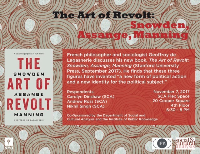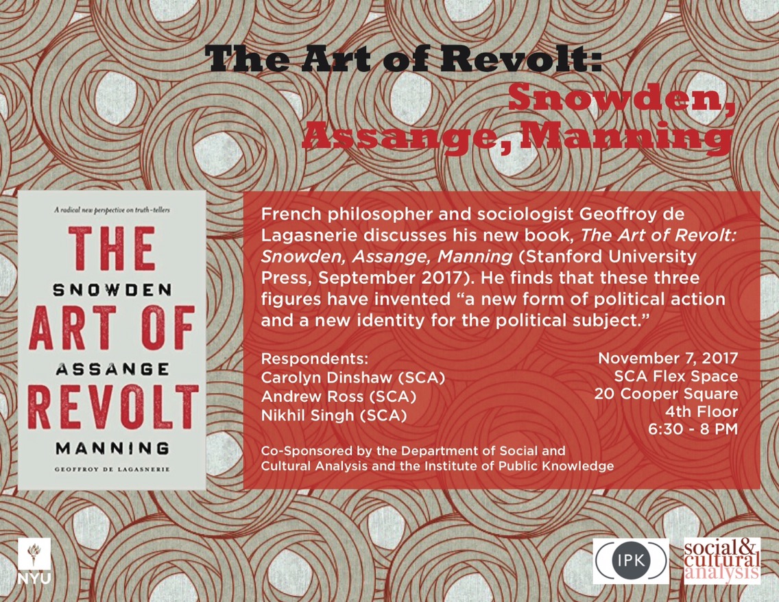 French philosopher and sociologist Geoffroy de Lagasnerie discusses his new book, The Art of Revolt: Snowden, Assange, Manning (Stanford University Press, September 2017).